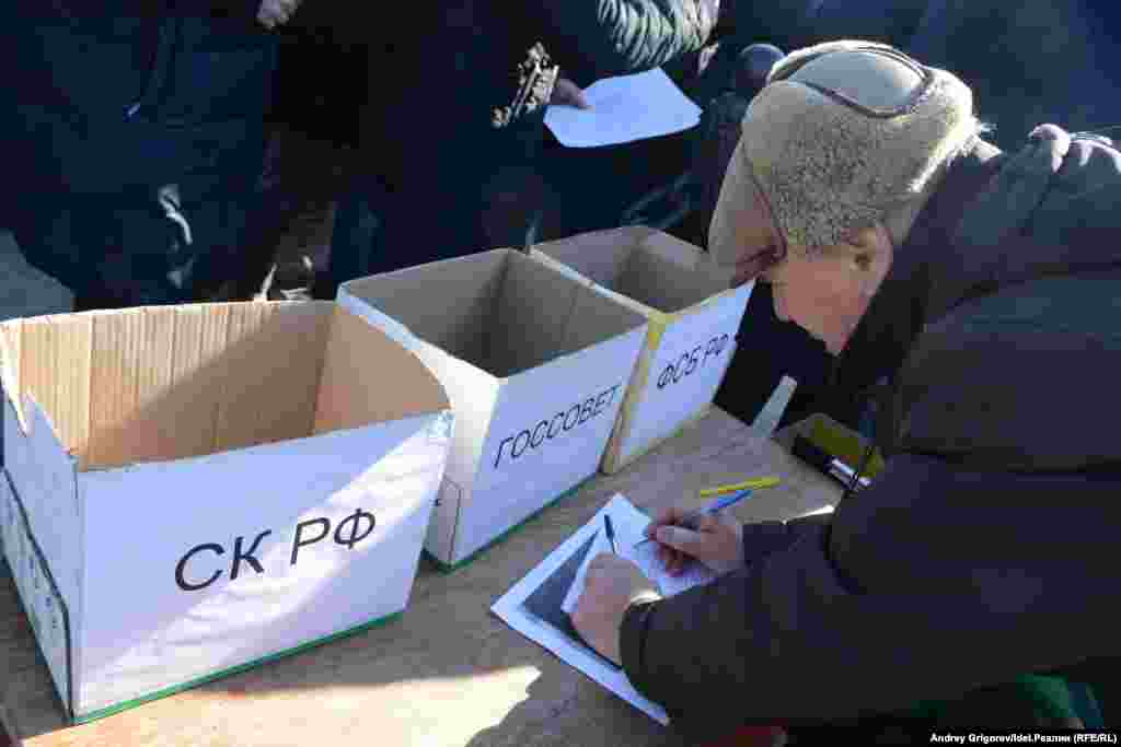 Участникам пикета предлагали подписать письма с уже отпечатанным текстом: наказ избирателя депутатам Госсовета Татарстана, обращение в Владимиру Путину и заявление о привлечении премьер-министра Татарстана и председателя совета директоров Татфондбанка к уголовной ответственности, адресованное силовым ведомствам. Заполненные бланки собирали в розовую коробку.
