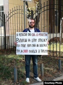 Перед зданием Кировского районного суда активисты движения "Аверс" провели одиночный пикет в поддержку Евдокии Романовой. В руках участник пикета держал плакат с текстом: "Я репостну про суд о репостах, Евдокии на штраф отложу. Куда проще нам сгнить на погостах, чем за слово садиться в тюрьму".​