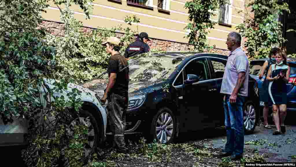 Свидетелем разбора завалов на фешенебельной улице Бассейная, спускающейся от Малой Красной к Пушкина мимо Верховного суда Татарстана, стал корреспондент "Idel.Реалии". Здесь дерево рухнуло сразу на несколько припаркованных у тротуара машин.